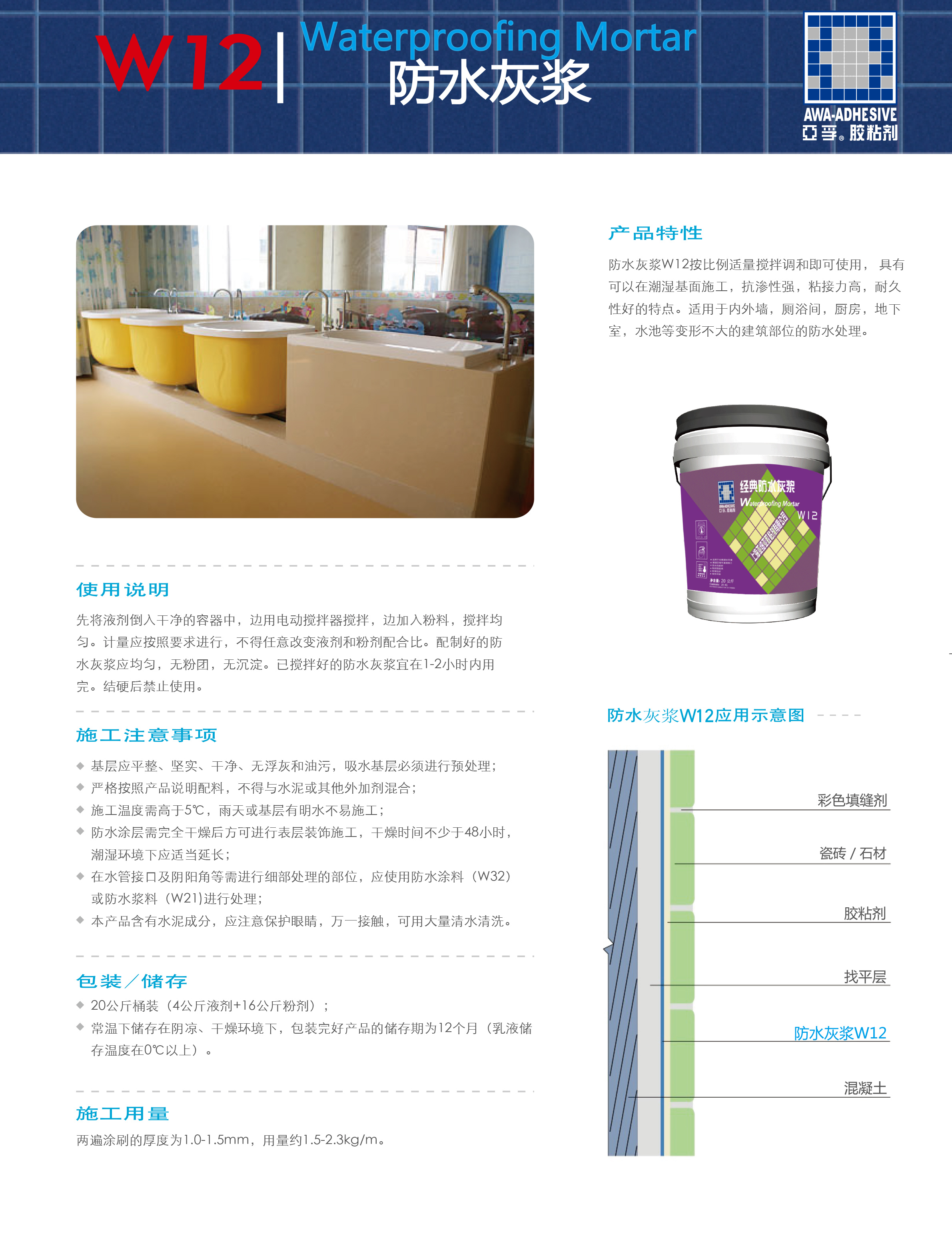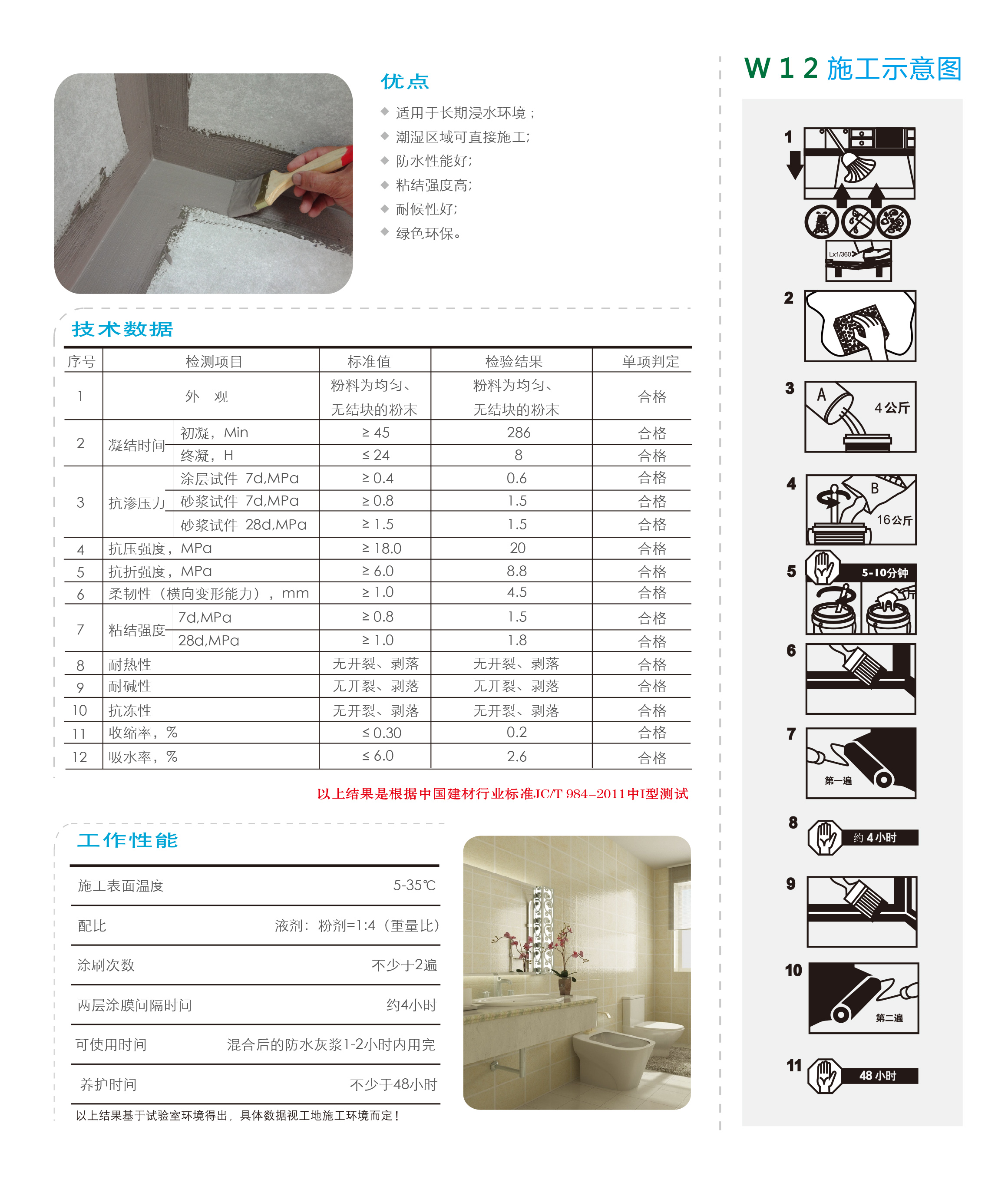 防(fang)水(shui)灰漿(jiang)W12按比(bi)例(li)適量攪(jiao)拌調咊(he)即(ji)可使用,具有可(ke)以在潮(chao)濕(shi)基麵施工,抗滲(shen)性強(qiang),粘結力(li)高,耐久(jiu)性好的特(te)點,適用于(yu)內外(wai)牆(qiang),廁(ce)浴(yu)間(jian),廚房,地(di)下室,水(shui)池等(deng)變形(xing)不(bu)大(da)的(de)建(jian)築部位(wei)的防(fang)水處(chu)理。