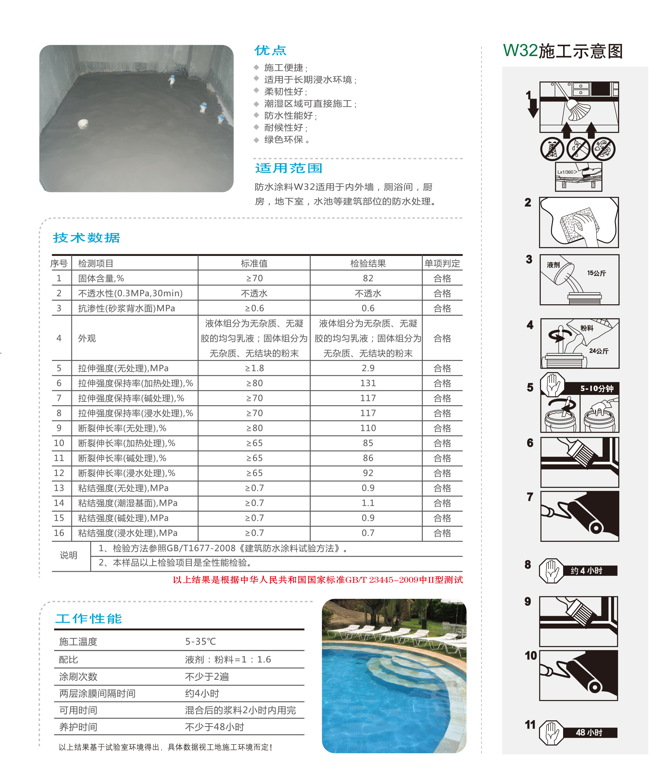 本(ben)産(chan)品(pin)按(an)比(bi)例(li)適(shi)量(liang)攪拌(ban)調咊(he)即(ji)可(ke)使用,具有(you)可(ke)以(yi)在潮(chao)濕基(ji)麵(mian)施(shi)工、柔(rou)韌性好、抗滲(shen)性(xing)強、粘(zhan)結(jie)力(li)高、耐(nai)久性好的特(te)點。適用于內外(wai)牆、廁浴間、廚(chu)房(fang)、地(di)下室(shi)、水池等建築部位的防(fang)水(shui)處(chu)理。